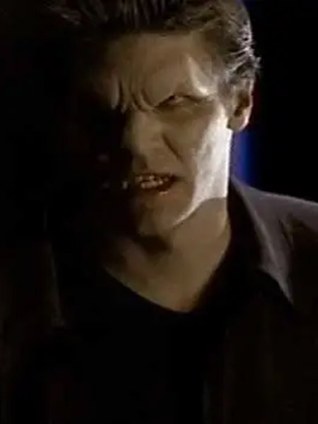 Angel est ici représenté sous sa forme de vampire nommée Angelus. Il porte une tenue presque toute noire avec un pantalon et des boots, un long manteau et une chemise d'un bleu très foncé. Au niveau de la tête, on retrouve sa tête de vampire avec son front proéminent et froncé et ses yeux jaunes. Il a bien sûr aussi sa bouche ouverte sur ses dents pointues de vampire. Enfin, il est dans une posture d'attaque avec les mains en avant et prêt à griffer.
