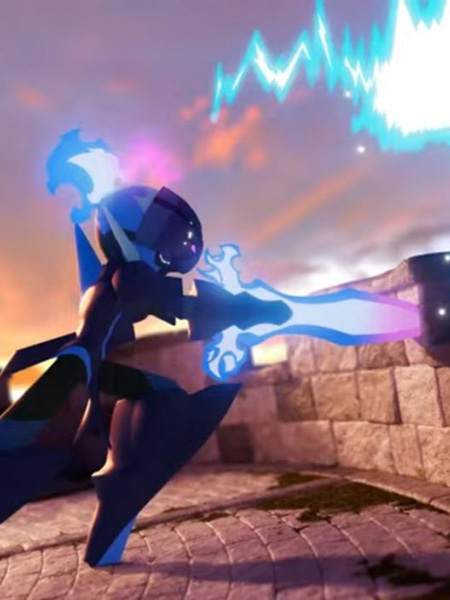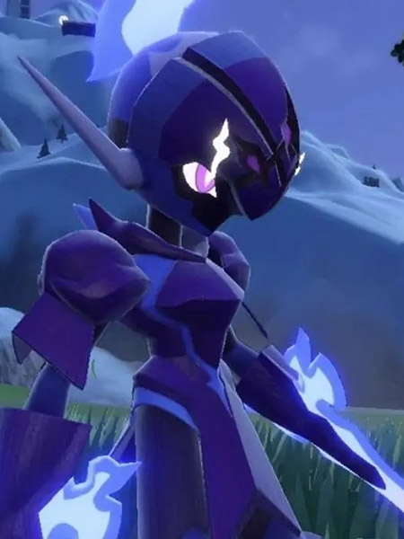 Ceruledge est donc ici représenté prêt au combat avec son corps bleu et violet humanoïde. On retrouve ses larges jambières au niveau des mollets ainsi que les deux grandes épées avec des reflets bleus et roses dans ses mains. Au niveau de la tête, on retrouve ce casque d'inspiration antique avec des sortes de pierres roses et deux pointes sur les côtés du visage. Sur le dessus de la tête, il a une flamme qui part vers l'arrière.