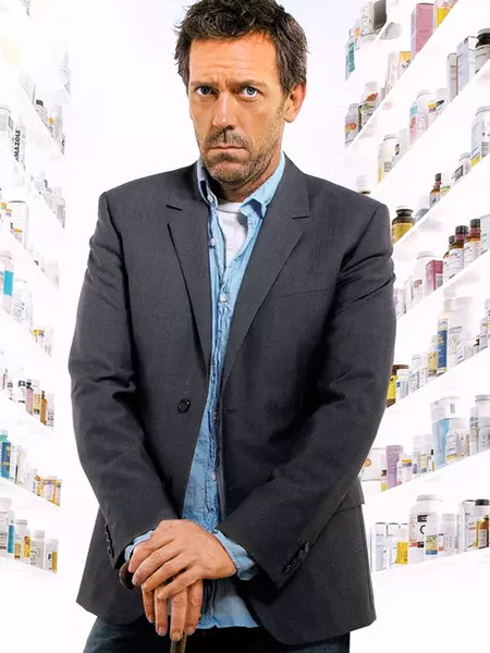 Le Docteur House est ici représenté avec son style le plus courant, c'est-à-dire un jean, une chemise bleu clair, une veste et des baskets. Il se tient avec une main dans la poche et l'autre tenant sa canne. Au niveau de la tête, on retrouve sa légère barbe et son bouc ainsi que ses cheveux bruns comme on peut le voir au début de la série (ils sont beaucoup plus gris/blancs à la fin).