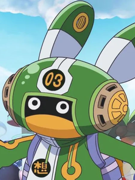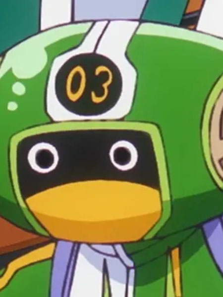 Edison est ici représenté avec son petit corps humanoïde vert et blanc avec de gros pieds verts, une sorte de robe verte et blanche avec des symboles ressemblant au japonais. Sa tête a la forme d'un ballon de rugby avec des yeux qui semblent fermés et un chiffre 3 sur le front. Il semble comme en vol et propulsé par de l'air.