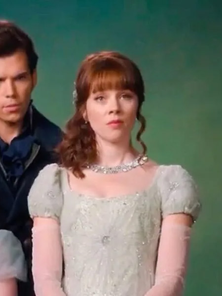 Eloise est ici représentée avec l'un de ces styles de la saison 3, portant une robe bleue, la couleur des Bridgerton, avec des motifs de fleurs ton sur ton. Elle porte aussi des gants blancs et tient un livre dans ses mains. Ses cheveux bruns sont ramenés sur le côté en grosses boucles romantiques avec une mèche qui tombe de l'autre côté et sa frange.