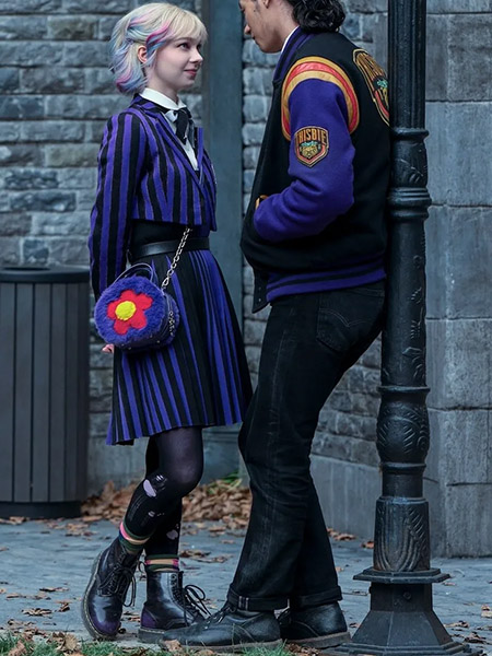 Enid est ici représentée avec la nouvelle version de son uniforme pour la saison 2. Celui-ci est plus à la mode, moins traditionnel et un peu plus adulte. Il est toujours rayé violet et noir mais la jupe est plus courte, l'ensemble plus ajusté avec une ceinture à la taille et le blazer est maintenant une veste courte. Elle le porte avec des collants noirs troués avec des bottines et des chaussettes colorées. Ses cheveux ne sont plus intégralement roses mais blonds avec des mèches roses, violettes et bleues. Elle tient dans sa main une tasse de café.