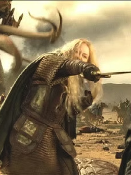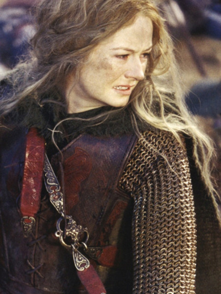 Eowyn est un personnage important des films Le Seigneur des Anneaux adaptés des célèbres romans d'heroic fantasy de Tolkien. Elle est la nièce du roi du Rohan qui l'a adoptée à la mort de ses parents. Elle est aussi la "shieldmaiden" du Rohan et devient l'héritière du roi quand son fils meurt au début du deuxième film. On la rencontre avec le reste du royaume du Rohan dans le deuxième film quand Gandalf, Aragorn, Gimli et Legolas viennent libérer le roi de l'emprise que Saruman a sur lui. Quand le royaume est attaqué, le roi décide de faire se retirer son peuple au gouffre de Helm, une forteresse plus défendable que sa capitale. Entrainée au combat et très indépendante, Eowyn veut se battre mais son oncle insiste pour qu'elle reste à l'abris. Mais dans le troisième film, quand l'armée du Rohan se rend au secours du Gondor, Eowyn décide de se battre. Elle emmène avec elle Merry, lui aussi décidé à défendre les siens et se déguise en soldat. Elle est celle qui parviendra à tuer le plus terrible des nazgul, le roi sorcier d'Angmar.