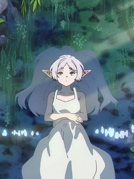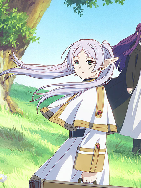 Frieren (Frieren au-delà de la fin du voyage en version française) est un animé adapté du manga du même nom de Kenehito Yamada. Frieren est une elfe magicienne dont, comme tous ceux de son espèce, la vie peut durer des millénaires. Au début de l'histoire, elle vient de vaincre le roi démon et restaurer l'harmonie après une quête de plus de dix ans auprès d'un groupe constitué d'un héros humain, Himmel, du nain Eisen et de l'humain Heiter. Avant de se séparer, ils observent une pluie de comètes et promettent de se retrouver pour la prochaine 50 ans plus tard. Entre temps, Frieren part à la recherche de plus de connaissances sur la magie, ne se rendant pas compte que même si 50 ans ne représentent rien pour elle, c'est beaucoup pour ses amis. En effet, quand elle revient, la capitale a beaucoup changé et après un dernier voyage pour la pluie de comètes Himmel meurt de vieillesse. Se sentant coupable, Frieren décide alors de se lancer dans une quête pour mieux connaître les humains. Elle prend pour disciple Fern, une jeune fille élevée par Heiter et Stark, un disciple d'Eisen.