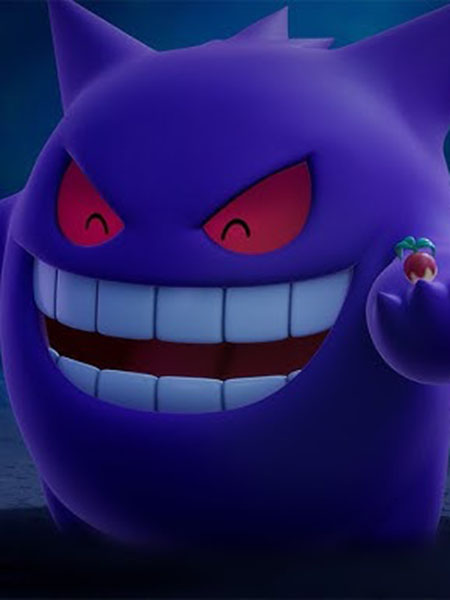 Gengar est donc ici représenté avec son apparence de fantôme tout rond et violet. Il a deux bras et deux jambes très courts ainsi que deux sortes d'oreilles pointues sur les côtés avec au milieu cinq autres pics plus petits. Au niveau de la tête, on retrouve aussi son large sourire mençant et ses yeux lui donnant une expression malicieuse.