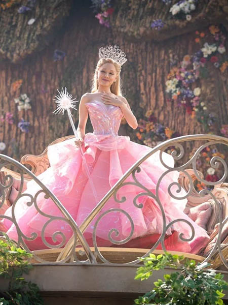Glinda est ici représentée avec la robe rose que l'on retrouve sur plusieurs versions d'affiches du film. Cette robe est une robe de princesse rose avec un haut bustier rappelant un peu deux pétales de rose. Le bas de la robe est très volumineux avec beaucoup de volants. On retrouve aussi ses longs cheveux blonds et sa couronne volumineuse transparente. Dans sa main, elle tient une baguette avec une étoile au bout et une teinte de rose venant du centre.