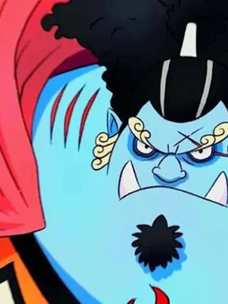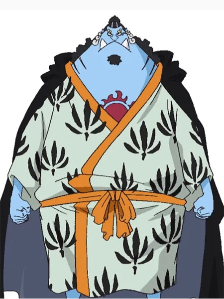 Jinbe est ici représenté portant son kimono orange avec des motifs de losanges noirs et blancs maintenu par une ceinture bleue. Il porte aussi une sorte de cape rouge et se tient avec une main en avant en posture de combat. On retrouve donc bien sûr aussi sa peau bleue et ses deux crocs dépassant de sa bouche ainsi que ses cheveux noirs avec des bandes blanches attachés en chignon sur le dessus de la tête.