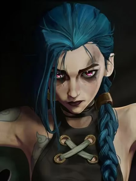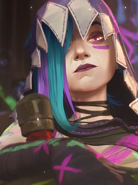 Jinx est un des personnages principaux de la série animée Arcane inspirée du célèbre jeu vidéo League of Legends. Dans cette série, on apprend les origines du personnage. Née Powder, après que ses parents furent tués par des pacificateurs, elle et sa soeur Vi se retrouvèrent orphelines et furent adoptés par Vander qui avait aussi adopté Mylo et Claggor. Ensemble, ils faisaient des braquages impressionnants. Mais Powder, instable et obsédée par les machines et explosifs avait tendance à faire louper certaines de leur opérations, ce qui poussa ses frères à l'appeler Jinx. Lors d'un combat contre leur ennemi Silco, l'un de ses explosifs finit enfin par marcher mais il tua accidentellement ses frères et leur père. Vi l'appela Jinx pour la première fois et l'abandonna à Silco qui devint à son tour son père adoptif.