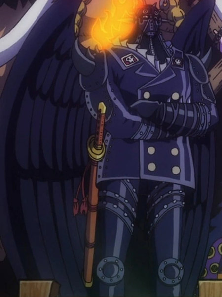 King est ici représenté avec son apparence impressionnante et plutôt terrifiante. Il porte une tenue violette et noire avec une élégante veste avec six boutons ainsi que des bottes entre le style cow-boy et armure médiévale. Au niveau de la tête, son visage est presque tout noir avec une sorte de masque, deux ronds bleus sur le front et sept pics autour de la tête. Sur le dessus de la tête, on retrouve aussi une grande flamme. Enfin, il a deux grandes ailes noires dans le dos.