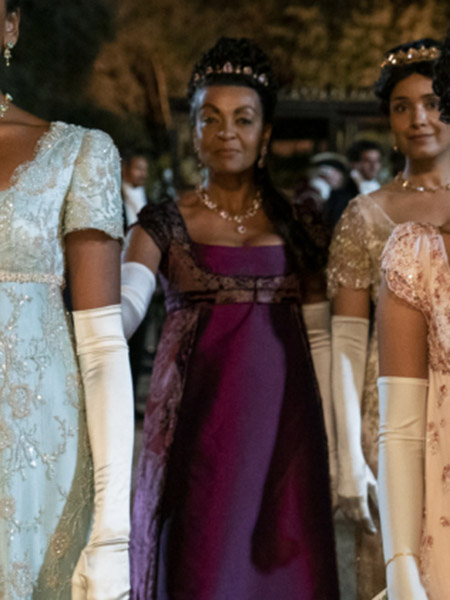 Lady Danbury est ici représentée avec l'une de ses tenues iconiques de la série. Elle porte ici une robe d'un rouge foncé comme c'est presque toujours le cas dans la série. Cette robe a des éléments dorés sur les manches et elle porte un collier doré assorti. Elle se tient avec une main sur la hanche et l'autre sur la canne qu'elle utilise pour marcher. Au niveau de la tête, on retrouve ses cheveux noirs attachés en chignon et un diadème doré.