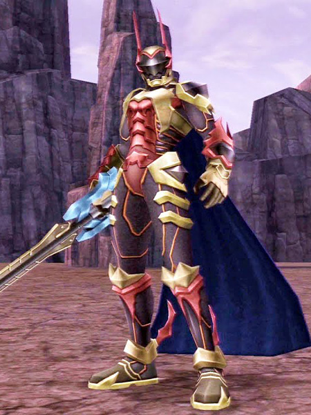 On retrouve donc cette impressionnante armure dorée d'inspiration médiévale avec des motifs rouges et jaunes au niveau des cuisses et du torse. Il porte aussi une longue cape violette avec les bords jaunes. A travers son casque, on peut voir qu'il n'y a pas de corps à l'intérieur et il tient sa keyblade dans la main droite.