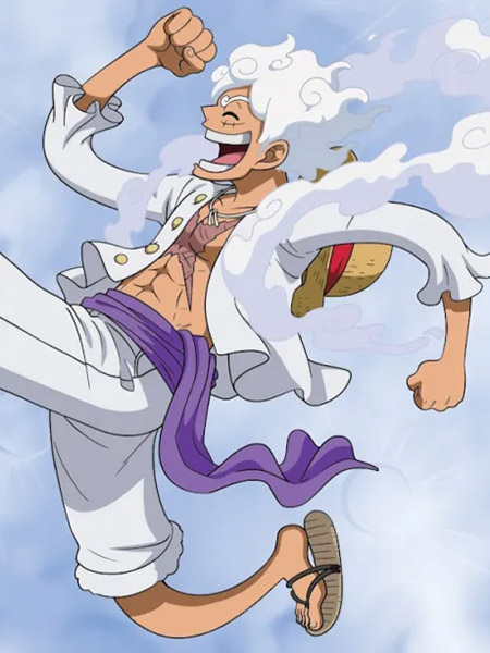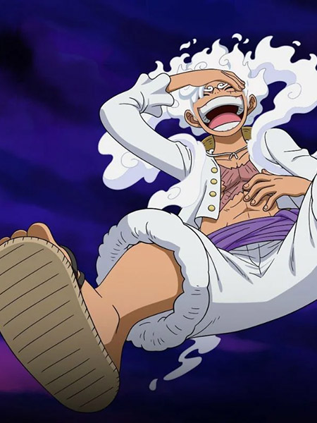 Luffy est ici représenté utilisant la technique de combat "gear 5" ou "gear fifth" de son vrai nom "l'éveil du gomu gomu no mi". Cela permet à son corps déjà très élastique d'être encore plus fort et libre et cela apporte aussi joie et liberté à ceux qu'il l'entourent. Comme on peut le voi sur cette figurine, cela veut dire que visuellement ses vêtements deviennent blancs et il est entouré d'une matière ressemblant à des nuages blancs au niveau des cheveux et autour de ses bras. Il est représenté ici en train de sauter sur un socle en plastique transparent et l'un de ses bras est fortement étendu.
