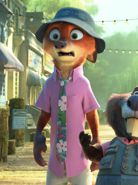 Nick est ici représenté avec la tenue qu'on le voit porter dans le premier trailer du film et qui rappelle un peu les tenues de Tom Selleck dans Magnum. Il porte une chemise rose à manches courtes avec une cravate à fleurs et un pantalon beige. On retrouve aussi sa fourrure brune et orange, son air très détendu et sûr de lui ainsi que sa queue de renard touffue à l'arrière.