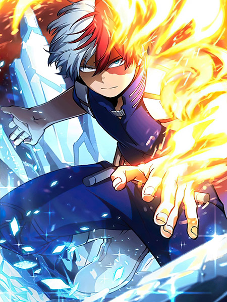 Shoto est ici représenté en plein combat en train de se servir de ses deux alter. Il porte son habituelle combinaison bleue avec des bottes et une ceintures grises et se tient avec les mains levées. Au niveau de la tête, on retrouve ses cheveux rouges d'un côté et blancs de l'autres. Du côté de son visage abimé par une cicatrice de brulure, son oeil est bleu. Enfin, il est entouré de glace mais une flamme rencontre aussi la glace devant lui.