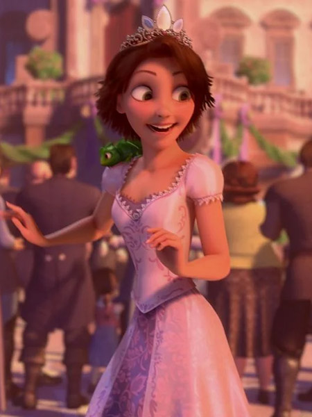 Raiponce est ici représentée telle qu'on la voit à la fin du film quand Flynn lui a coupé les cheveux pour l'empêcher d'être refaite prisonnière par la sorcière et qu'elle a enfin retrouvé ses parents. Elle porte son habituelle robe violette et rose avec des manches ballons et un laçage sur le devant et se tient avec les mains sur les hanches. Ses cheveux, maintenant courts, sont aussi devenu bruns et elle porte une couronne sur la tête.