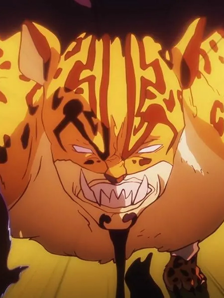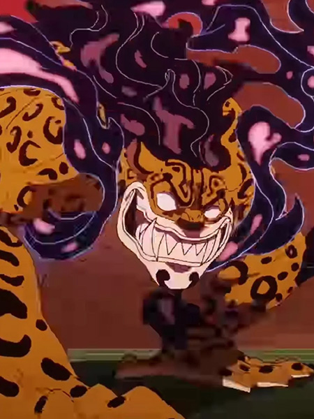 Rob Lucci est donc ici représenté sous sa forme de jaguar venant de se transformer. On peut voir son puissant corps de jaguar se tenant sur ses quatre pattes avec son motif de tâches de léopard. Il porte cependant encore son costume blanc sur le bas du corps et il est entouré de sortes de flammes noires et violettes. Il a la gueule grande ouverte sur des dents acérées.