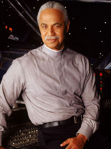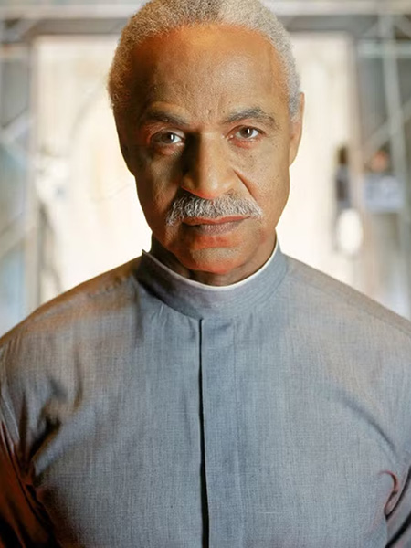 Le pasteur Book est ici représenté avec sa tenue très sobre de pasteur avec son pantalon noir et sa chemise grise avec un col qui rappelle celui d'un pasteur d'aujourd'hui. On retrouve aussi sa peau noire avec ses cheveux gris/blancs ramenés en arrière et sa moustache de la même couleur. Dans sa main gauche, il tient sa bible.