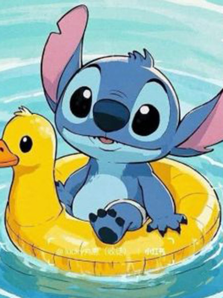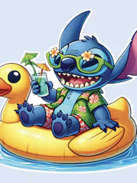 Pour cette nouvelle version du personnage, Stitch est ici représenté portant une grosse bouée jaune avec une tête de canard autour de la taille. Cela fait un clin d'oeil à sa rencontre avec des canards et à sa lecture du vilain petit canard dans le premier film. Il est aussi dit que son corps est trop dense pour flotter, il est donc indispensable qu'il porte une bouée pour aller dans l'eau. On retrouve sinon son habituel corps bleu avec sa grande bouche et sa truffe noire et il porte de grosses lunettes de soleil. Il est aussi représenté sous sa forme "terrienne" avec deux bras au lieu de 4 et sans les antennes et sur sa tête.