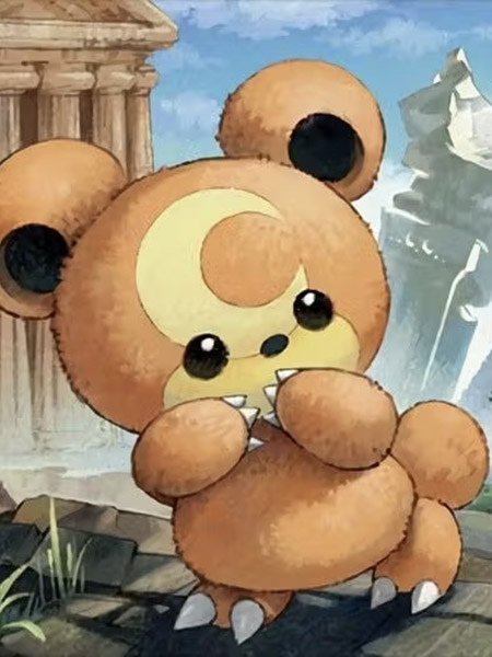 Teddiursa est un adorable petit pokémon de deuxième génération de type normal. C'est un petit pokémon qui se tient sur ses pattes arrières le plus souvent et on le voit tout le temps se lécher la patte avant car celle-ci secrète son propre miel. Il aime cependant tellement ça qu'il est aussi toujours à la recherche de miel d'abeille et les marques sur son visage s'allument quand il en a trouvé. Il peut évoluer en Ursaring puis Ursaluna.