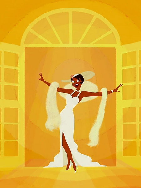 Tiana est ici représenté telle qu'on la voit dans la vision que lui montre le sorcier vaudou quand il essaie de l'acheter en lui disant qu'il peut l'aider avec son restaurant. Elle porte une élégante robe blanche, ici recouverte de paillettes argentées, avec des chaussures assorties. Elle porte aussi une sorte de boa jaune et tient dans sa main une amulette vaudou. Au niveau de la tête, ses cheveux sont coupés au carré à la mode années 20 avec une plume dans les cheveux. Elle est posée sur un socle en plastique transparent et semble flotter.