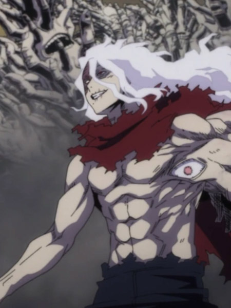 Tomura Shigaraki est le nom adopté par Tenko Shimura quand celui-ci devint un super-vilain dans le manga et l'animé My Hero Academia. L'histoire de ce personnage est assez tragique puisqu'enfant il était fasciné par les super-héros. Mais son alter mettant du temps à se manifester, son père était très cruel avec lui. Et quand celui-ci, désintégration, se manifesta enfin de manière spectaculaire, il tua par accident son chien puis sa mère et sa grand-mère. Il se retrouva alors à la rue avant d'être adopté par le super-vilain All for One. Celui-ci vit son potentiel et l'aider à développer son pouvoir en lui donnant des mains désincarnés qui l'amplifient et qui font son apparence si particulière. Il fut ensuite chef de plusieurs organisations de super-vilains et absorba plusieurs alter à différents moments de sa vie, dont le All for One qui lui permet d'absorber les autres alters.