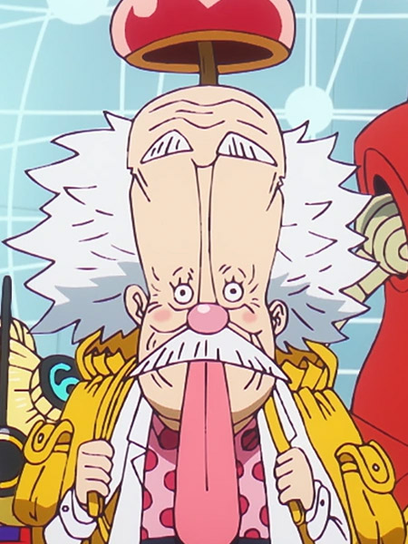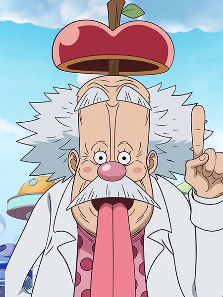 Le Dr Vegapunk est représenté avec son look rappelant une sorte d'Einstein excentrique. Il a des cheveux blancs ébouriffés, une moustache et un nez rouge. Il est représenté avec sa longue langue sortie, rappelant la fameuse photo du scientifique. Il porte aussi un pull rose à pois avec une blouse blanche et des chaussures violettes qui sont aussi des propulseurs. Enfin, il porte une sorte de béret en forme de pomme rappelant la pomme qui aurait inspiré à Newton la théorie de la gravité.
