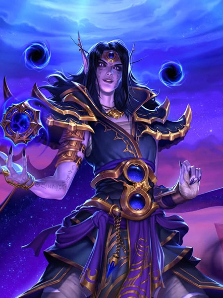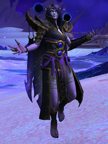 Xal'atath est donc ici représentée avec son corps d'elfe de la nuit avec une peau dans des teintes de violet, de longues oreilles pointues et des sourcils longs et pointus. On retrouve aussi une tenue d'inspiration elfique avec un pagne, des armures sur les épaules et des dorures. Mais on peut aussi voir qu'elle porte des bandages aux jambes et qu'elle est pieds nus avec des ongles noirs. Elle a aussi des cheveux violets et des signes magiques sur la peau du visage et des bras. Enfin, elle est entourée de sortes d'orbes noires magiques.
