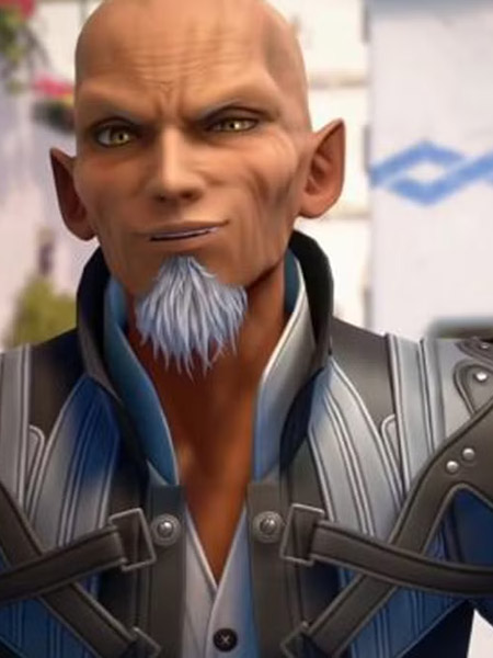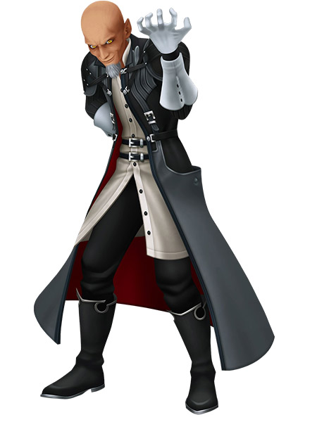Xehanort est ici représenté sous sa forme plus âgée avec son crâne rasé, ses yeux jaunes et sa petite barbe fine. Il porte un long manteau gris élégant avec des gants blancs, des bottes noires et une élégante tunique avec plusieurs ceintures. Enfin, il tient dans sa main une impressionnante keyblade avec d'élégantes gravures argentées et une pierre bleue.